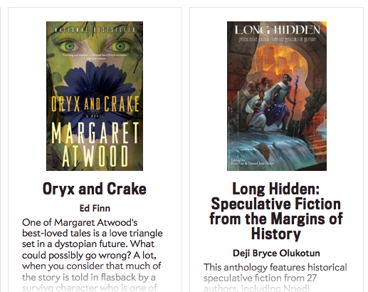 The list of books includes such well-known and respected authors as Margaret Atwood, Kim Stanley Robinson, Cory Doctorow, Elizabeth Bear, and Samuel Delaney. The list also includes an anthology that has a story by yours truly in it, Long Hidden: Speculative Fiction from the Margins of History.