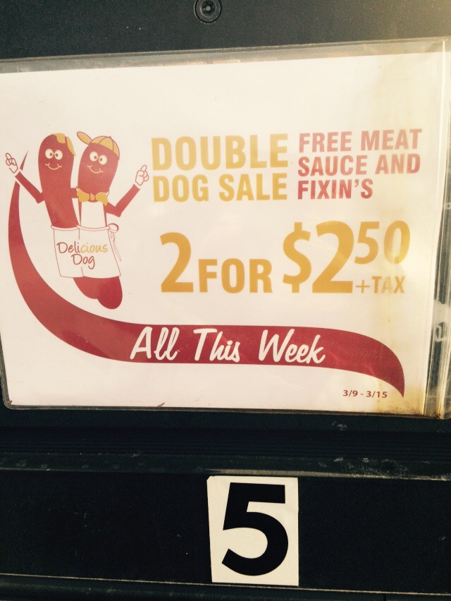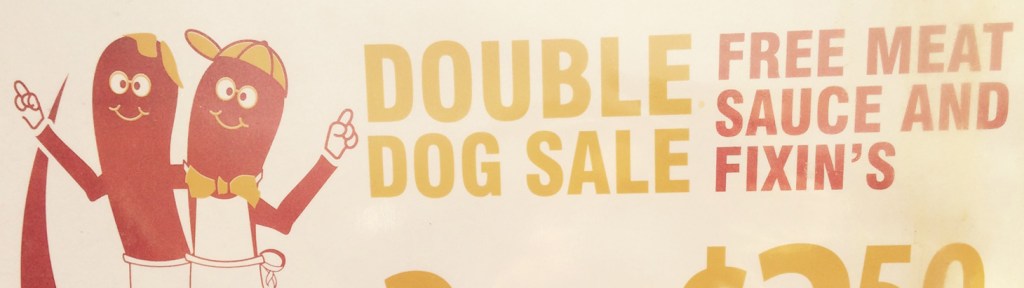Of course, that wasn’t the end of the line, but in my years as a headline writer I’ve come to respect linebreaks in a way a poet can understand. That the end of a line is an occasion for meaning. So I focused on “free meat,” before I realized that what the sign was really talking about was “free meat sauce” to go on the hot dogs, as well as “fixin’s.” So though the apostrophe may be correct as a way to signify a dropped letter, in this case a “g,” it also has the unintended consequence of making the word seem like it is a possessive (as in these signs).
