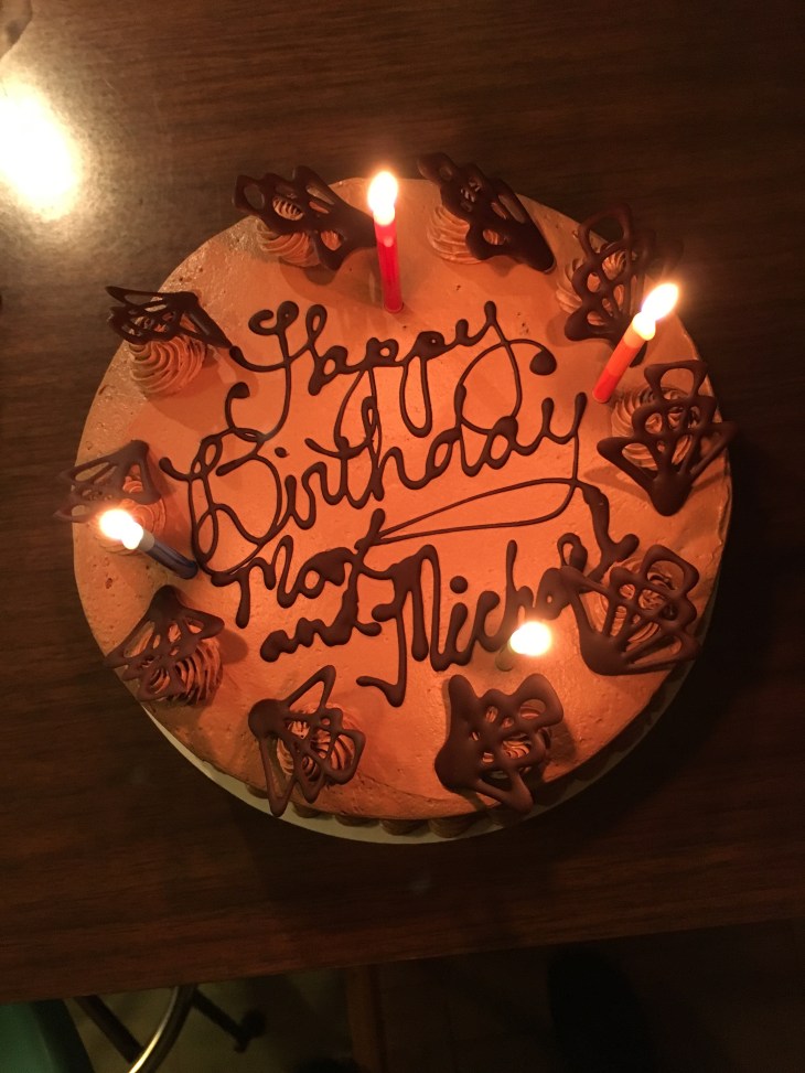 Wonderful chocolate cake for me and The Boy, who came home from NYC for a joint birthday celebration.