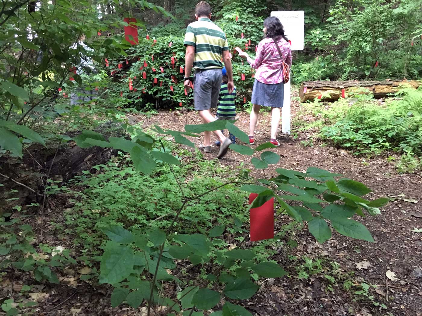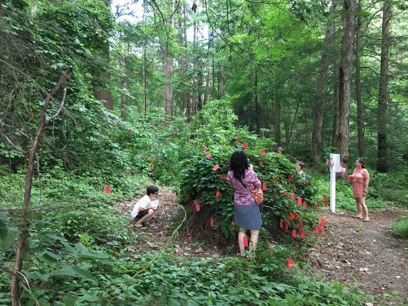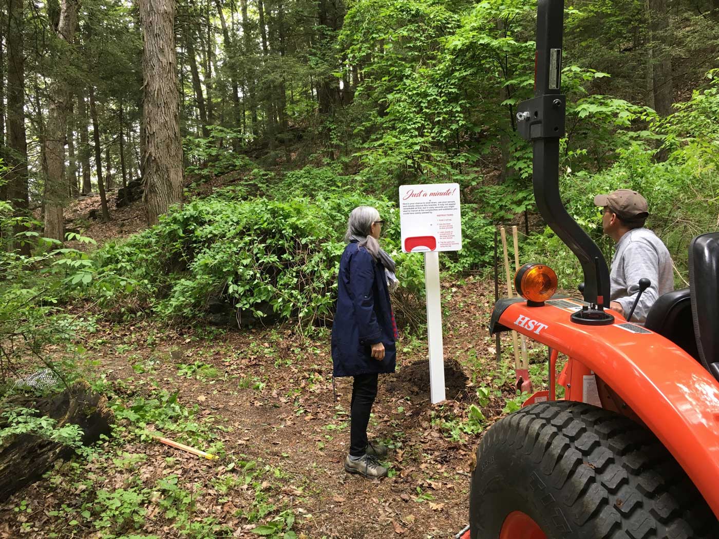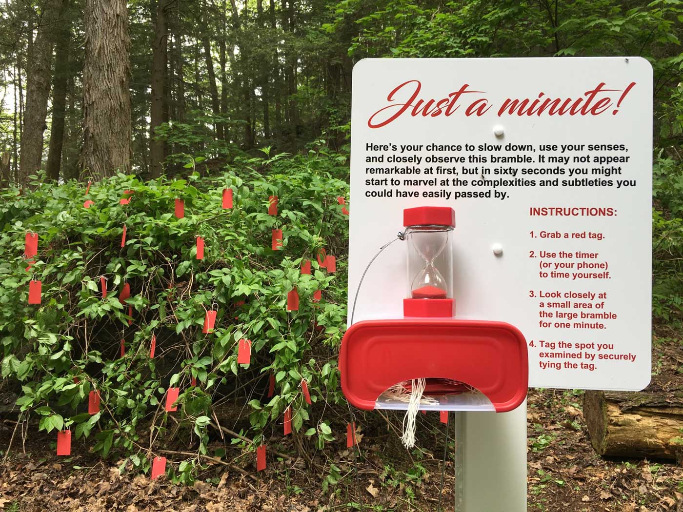 Curator Sharon Bates helps with the installation of Deborah Zlotkys’s “Just a Minute!” at Chesterwood in May 2017.“Just a Minute” at Chesterwood, 2017, invites viewers to slow down, use their senses, and experience the natural world in a way that draws attention to a small area that could easily be overlooked.A boy, at left, finds a spot for close observation, while his mother, at right, operates the timer to tell him when to start and stop looking during Chesterwood’s opening of “Out of Site: Contemporary Sculpture at Chesterwood” in June 2017.A tag at Chesterwood.
